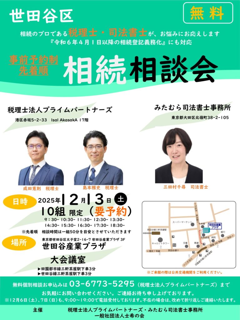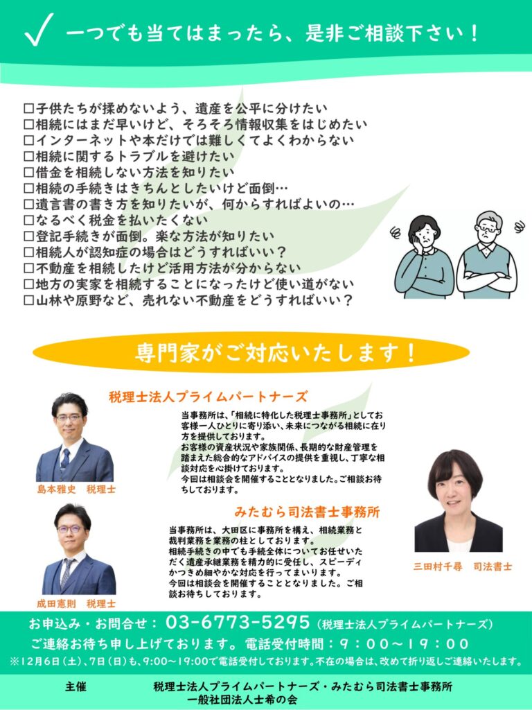 12月13日(土)、一般社団法人士希の会様、みたむら司法書士事務所様との共催で、世田谷区内にて無料の相続相談会を開催いたしました 。